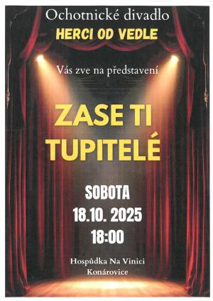 Ochotnické divadlo Konárovice " HERCI OD VEDLE" Vás zve na představení Zase ti tupitelé v sobotu 18.10.2025 od 18:00 v Hospůdce na Vinici.