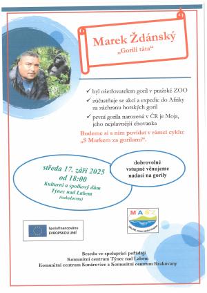 Komunitní centrum Týnec nad Labem a Konárovice pořádají besedu 17.9.2025 od 18:00 v Sokolovně v Týnci nad Labem s Markem Žďánským " Gorilí táta".
