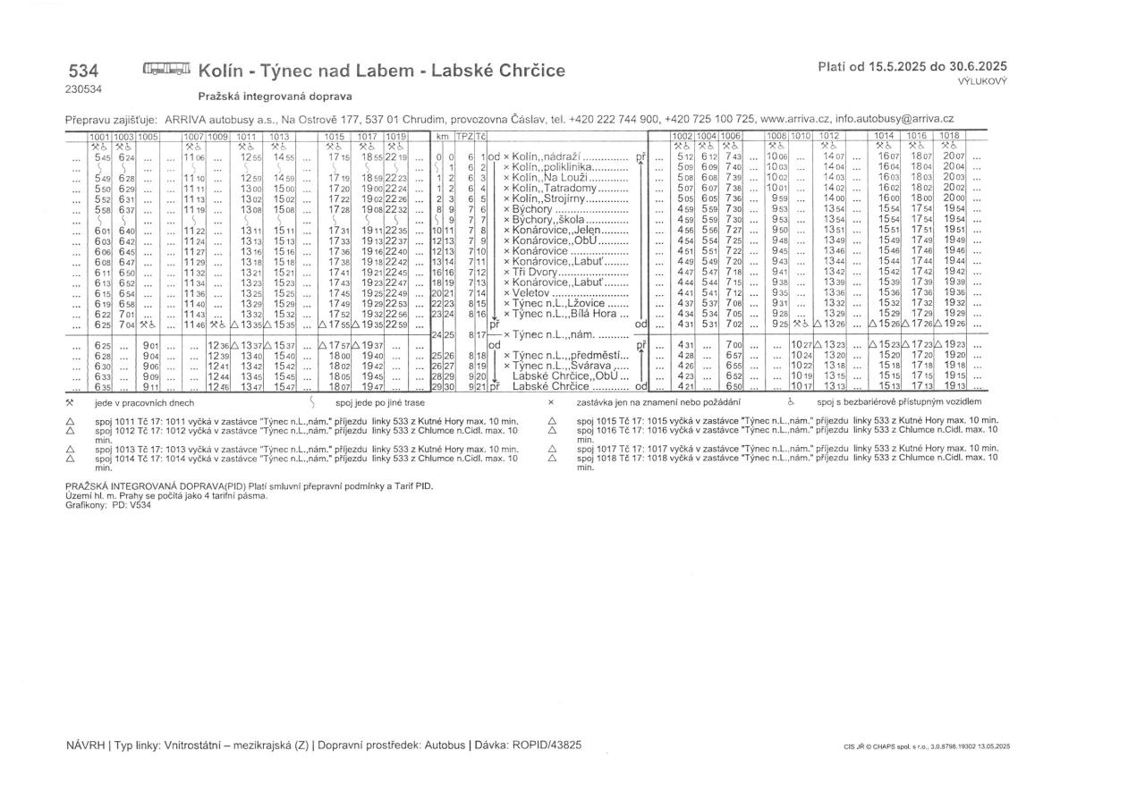 Výlukový jízdní řád linky 534 vztahující se k ukončení uzavírky Labské Chrčice konečné etapy C a pokračující uzavírce Kolín,,ul.Třídvorská do 30. 6. 2025 s tím, že začala uzavírka Hradišťko II a projevené změny na lince 533 musí akceptovat i linka 534, na které dochází k čas.posunům vybran.spojů