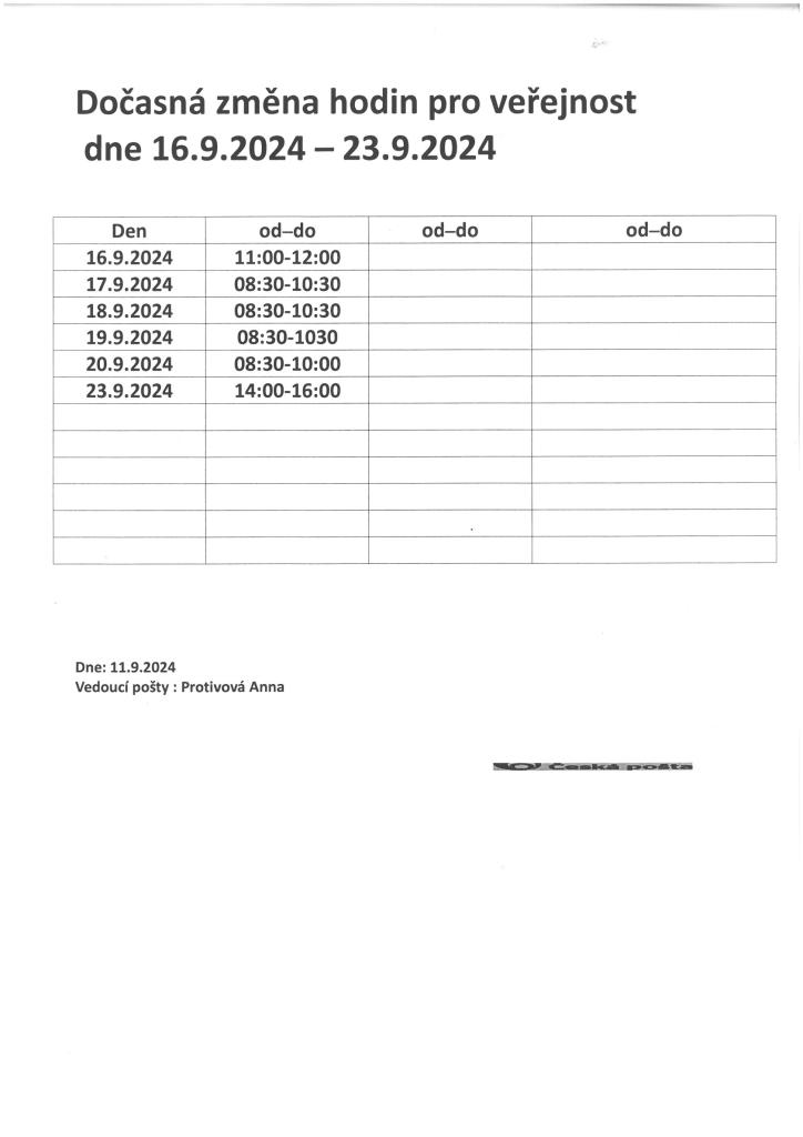 Dočasná otevírací doba Pošty Partner od 16.9.- 23.9.2024