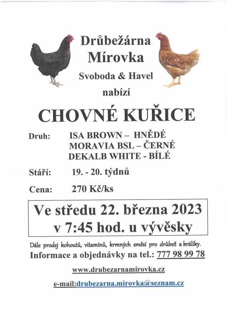 Drůbežárna Mírovka přijede prodávat chovné kuřice 22.3.2023 v 7:45 hod. Na Rynku, barva hnědá, černá, bílá. Stáří 19.- 20.týdnů, cena 270,-Kč/kus. Informace a objednávky na tel.č. 777 98 99 78.