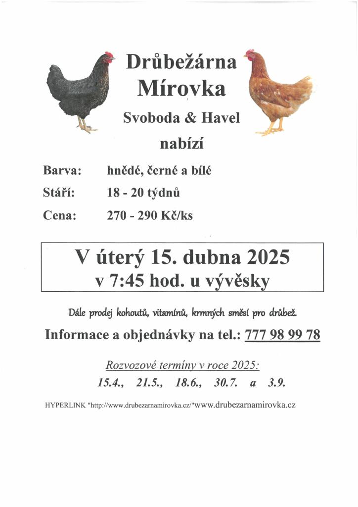 Drůbežárna Mírovka přijede prodávat chovné kuřice 15.4.2025 v 7:45 hod.