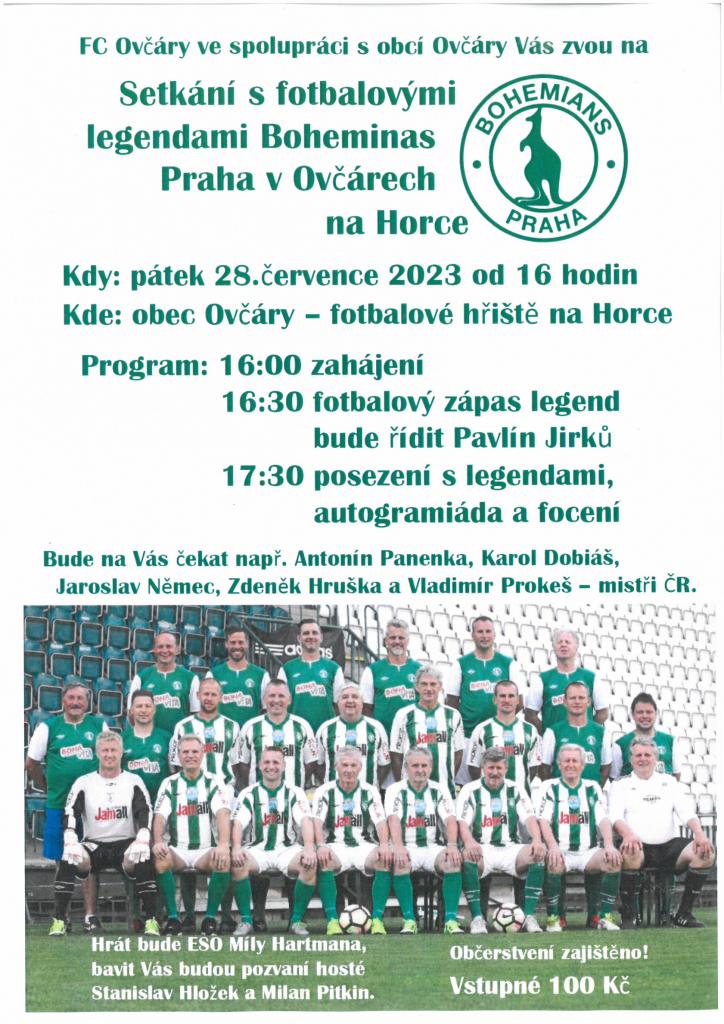 FC Ovčáry ve spolupráci s obcí Ovčáry zvou na setkání s fotbal. legendami Bohemians Praha v Ovčárech na Horce na fotbalovém hřišti v pátek 28.7.2023 od 16:00 hod.