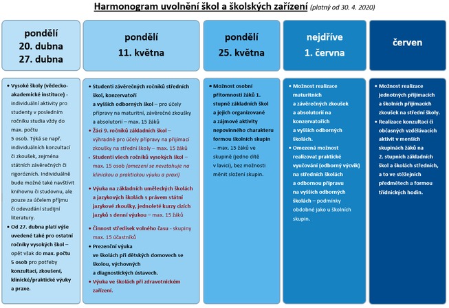 Harmonogram uvolňování škol a školských zařízení platný k 30.4.2020