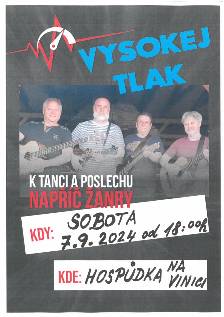 Kapela Vysokej tlak zahraje v sobotu 7.9.2024 v Hospůdce na Vinici od 18:00hod.