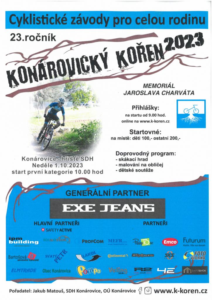 Konárovický kořen 2023 - cyklistické závody pro celou rodinu. V neděli 1.10.2023 start první kategorie v 10:00 hod. Přihlášky na startu od 9:00 hod. nebo online na www.k-koren.cz. Startovné na místě: děti 100,-Kč, ostatní 200,-Kč.