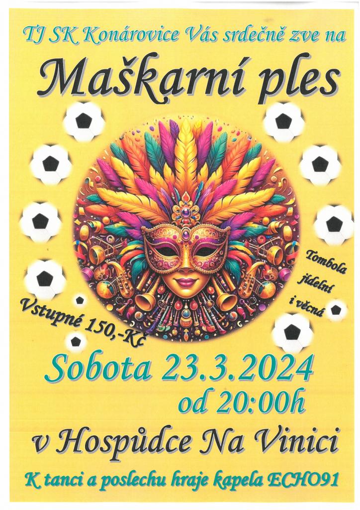 TJ SK Konárovice Vás zve na Maškarní ples v sobotu 23.3.2024 od 20:00 hod. v Hospůdce na Vinici. K tanci a poslechu hraje kapela ECHO 91. Vstupné 150,-Kč.