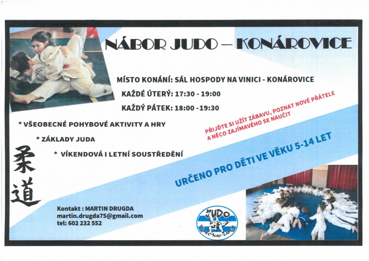 Nábor JUDO Konárovice proběhne v Hospůdce na Vinici – trénink každé úterý 17:30 – 19:00, každý pátek : 18:00 -19:30. Určeno pro děti 5 – 14 let. Kontakt pan Drugda: 602 232 552.