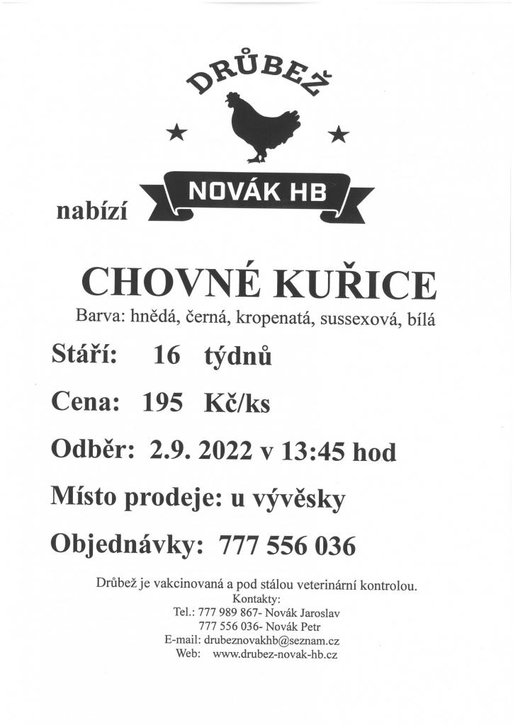 Drůbež Novák HB- drůbežárna Mírovka, přijede prodávat v pátek 2.9.2022 ve 13:45 hod., nosné kuřice před snůškou stáří 16.týdnů, cena 195,- Kč za kus, barva hnědá, černá, kropenatá, bílá a sussexová. Objednávky tel.č. 777 556 036.
