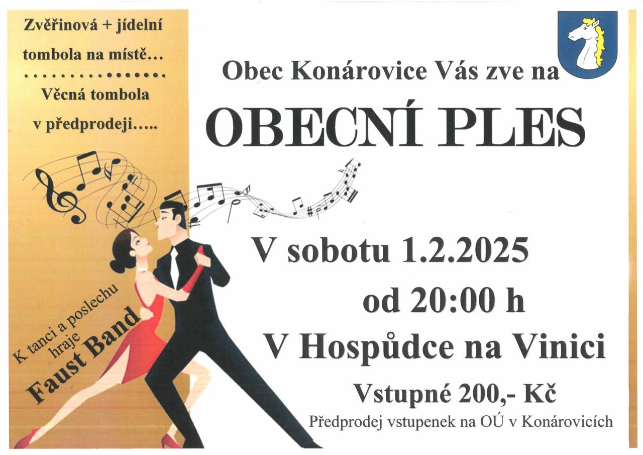 Srdečně Vás zveme na Obecní ples v Konárovicích v sobotu 1.2.2025 od 20:00 hod. v Hospůdce na Vinici. Předprodej vstupenek na OÚ v Konárovicích. Vstupné 200,-Kč. Čeká na Vás bohatá zvěřinová + jídelní tombola na místě. Věcná tombola v předprodeji.
