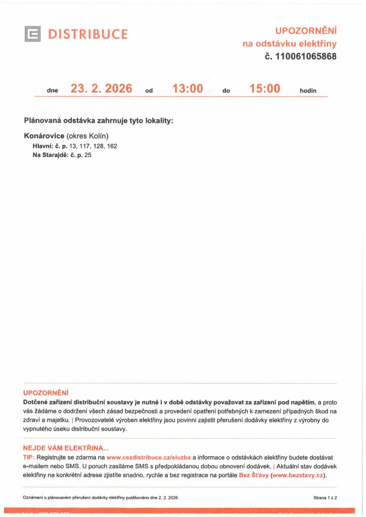Firma ČEZ oznamuje odstávku elektrické energie 23.2.2026 od 13:00 - 15:00. Hlavní č.p. 13, 117, 128, 162. Na Starajdě č.p. 25.