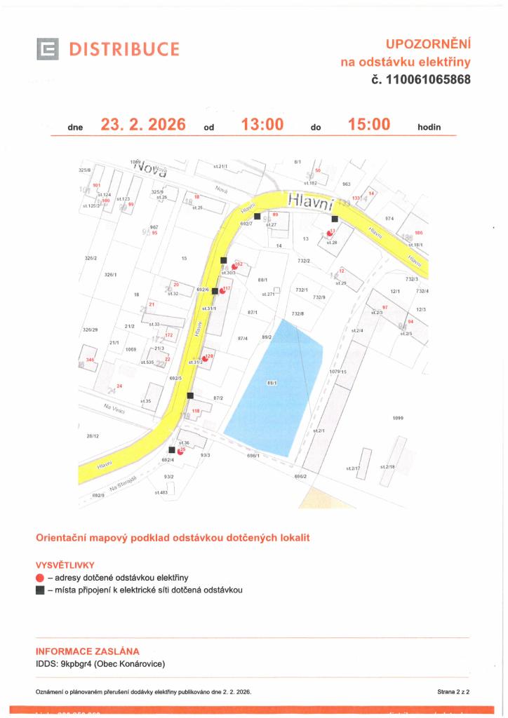 Odstávka elektrické energie 23.2.2026 od 13:00 - 15:00