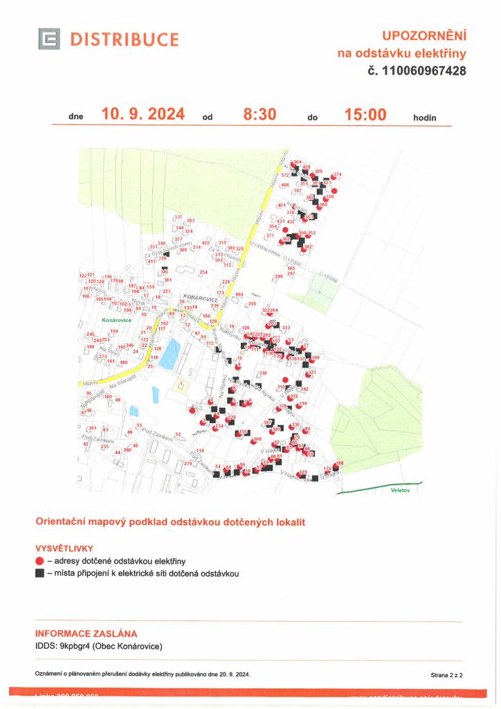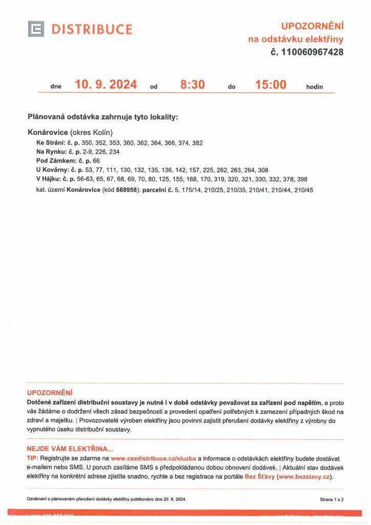 Odstávka elektřiny 10.9.2024 od 8:30 - 15:00