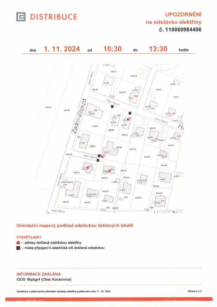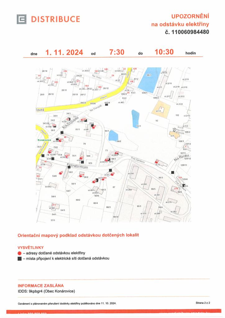 Oznámení o přerušení dodávky elektrické energie 1.11.2024 v době od 7:30 - 10:30, 10:30 - 13:30.