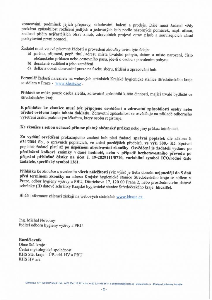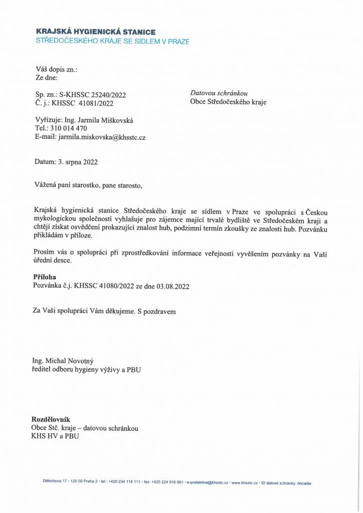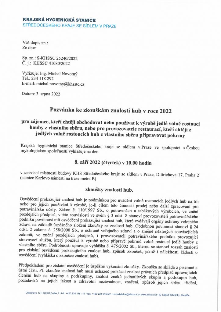 Pozvánka ke zkouškám znalosti hub v roce 2022 viz. příloha