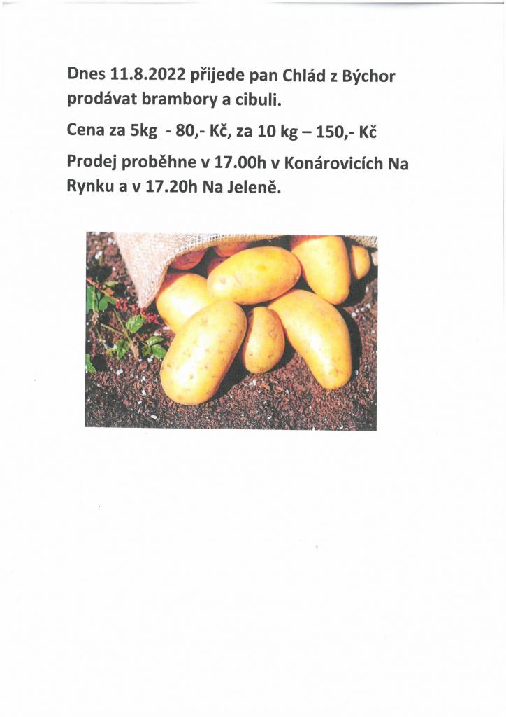 Dnes 11.8.2022 přijede pan Chlád z Býchor prodávat brambory a cibuli. Cena za 5kg - 80,- Kč, za 10 kg – 150,- Kč