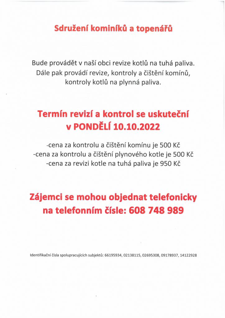 Sdružení kominíků a topenářů - termín revizí a kontrol 10.10.2022 viz. příloha.