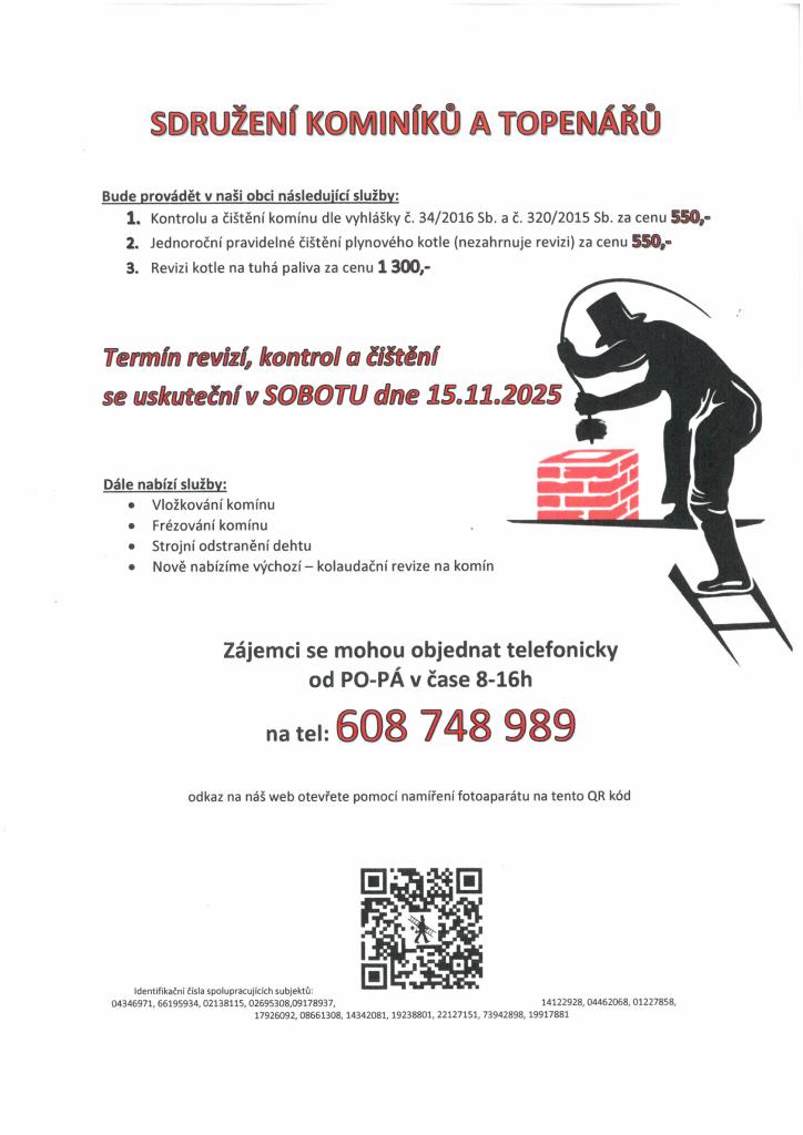 Firma Sdružení kominíků a topenářů přijede v sobotu 15.11.2025 a bude provádět revize, kontroly a čištění komínů. zájemci se mohou přihlásit na tel.č. 608 748 989, Po-pá v čase od 8-16 hod.