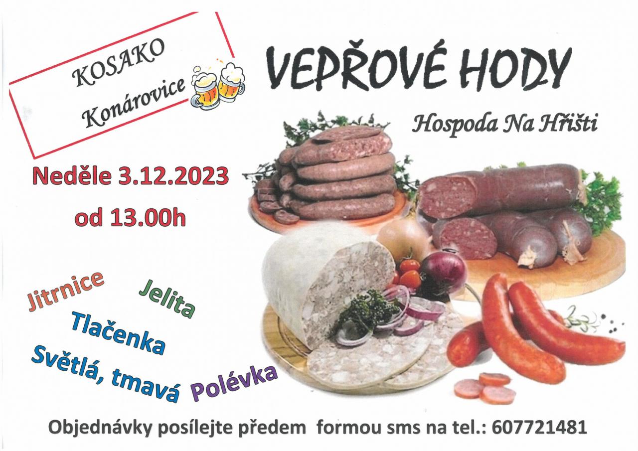 Šipkaři KOSAKO Konárovice pořádají vepřové hody v neděli 3.12.2023 od 13:00 hod. Objednávky posílejte předem formou sms na tel.č.607 721 481. Můžete objednávat jitrnice, jelita, polévku, světlou a tmavou tlačenku.