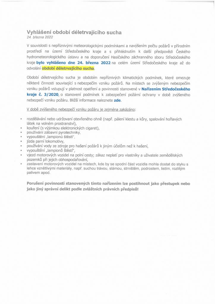 Dnes 24.3.2022 bylo na celém území vyhlášeno Středočeským krajem až do odvolání období déletrvajícího sucha viz. příloha.