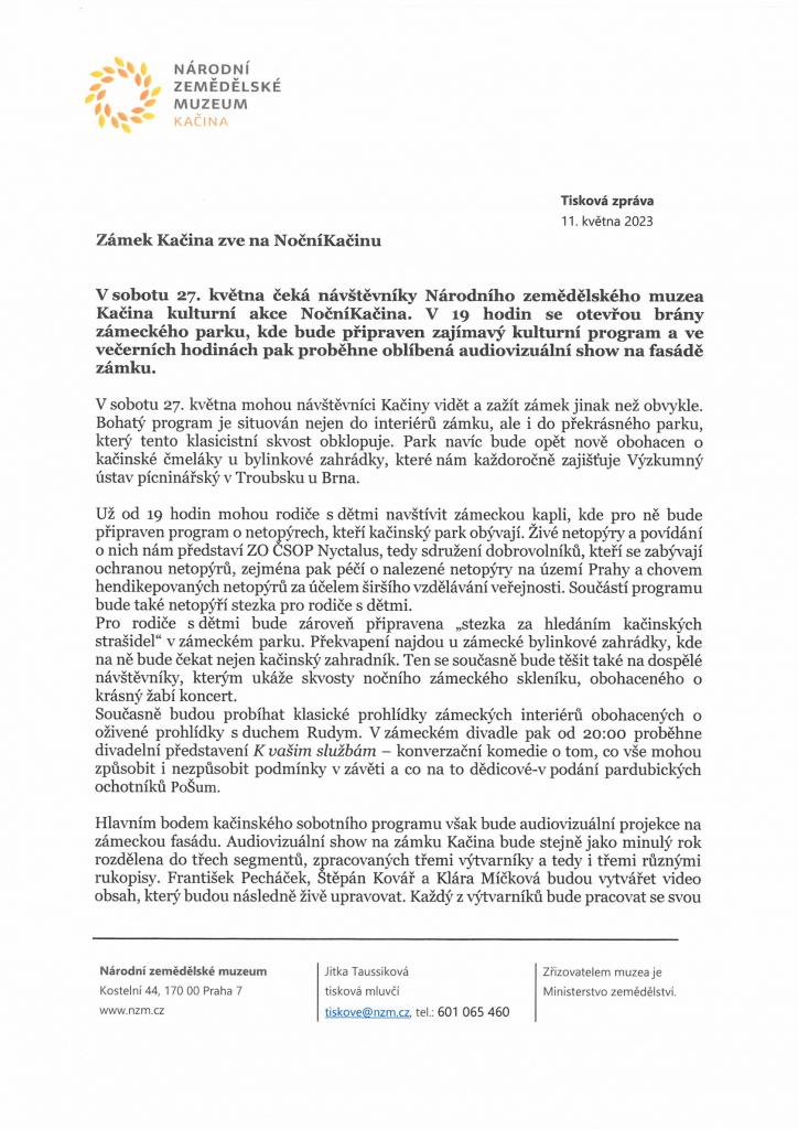 Zámek Kačina zve na NočníKačinu v sobotu 27.5.2023 od 19:00 hod.