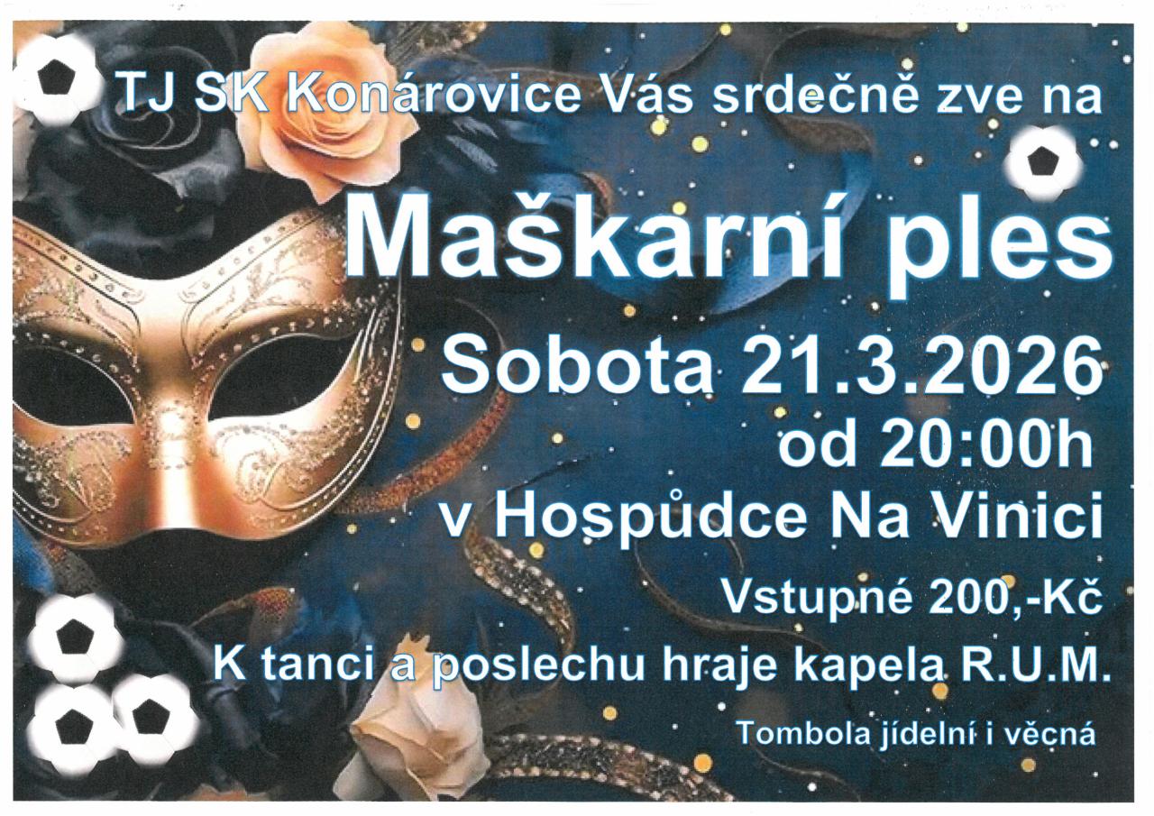 TJ SK Konárovice Vás srdečně zve na Maškarní ples v sobotu 21.3.2026 od 20:00 hod. v Hospůdce na Vinici. K tanci a poslechu hraje kapela R.U.M. Tombola bude jídelní i věcná.