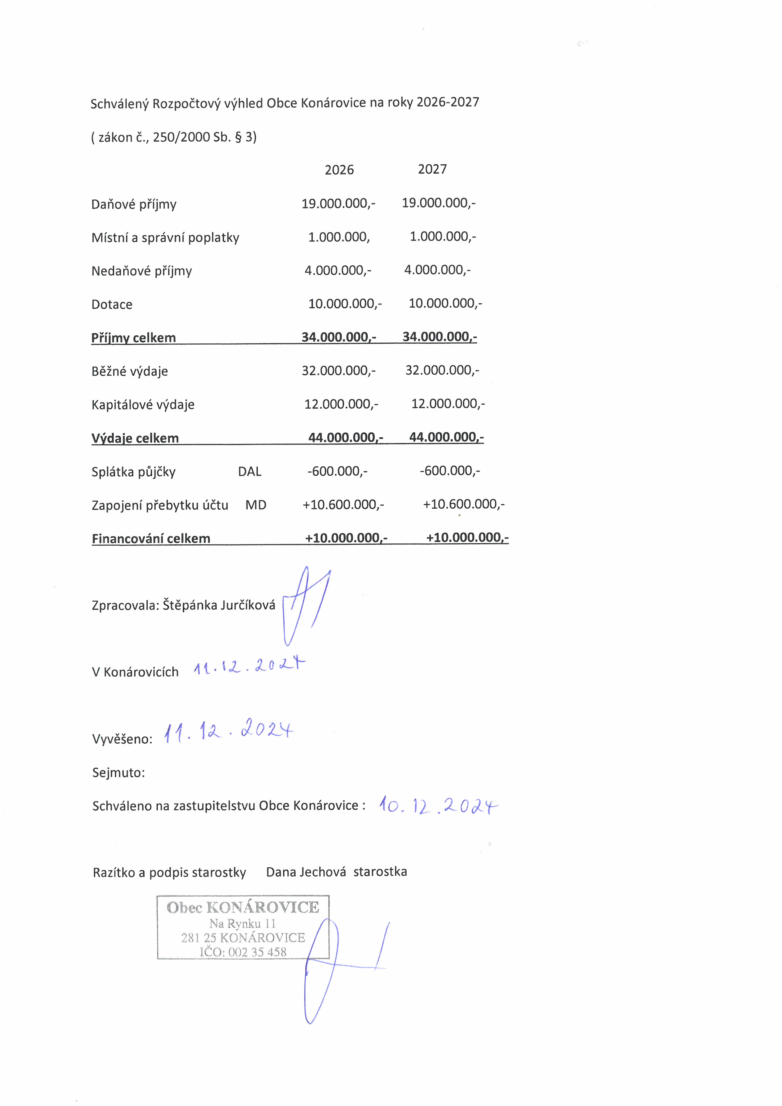 Schválený rozpočtový výhled Obce Konárovice na roky 2026-2027